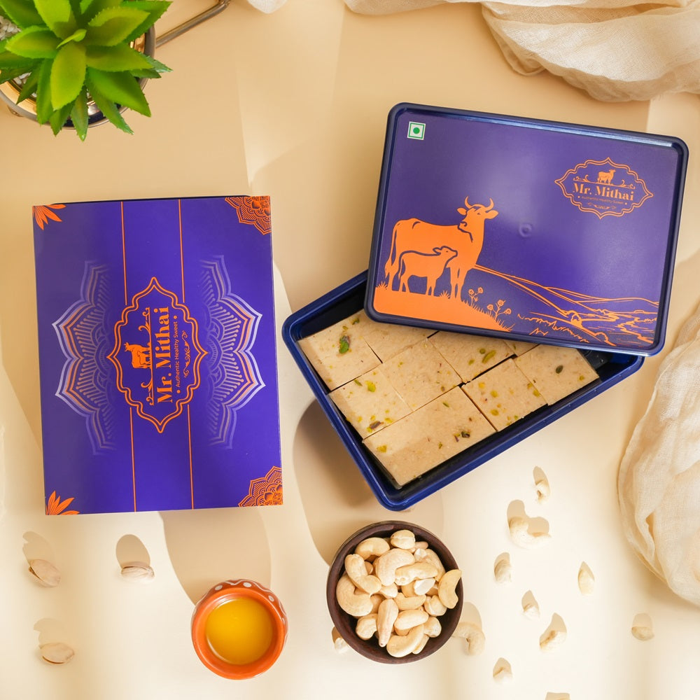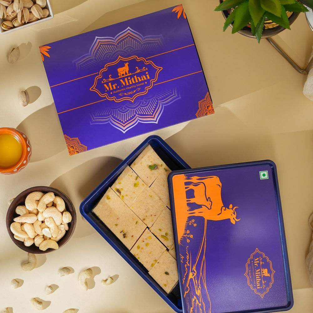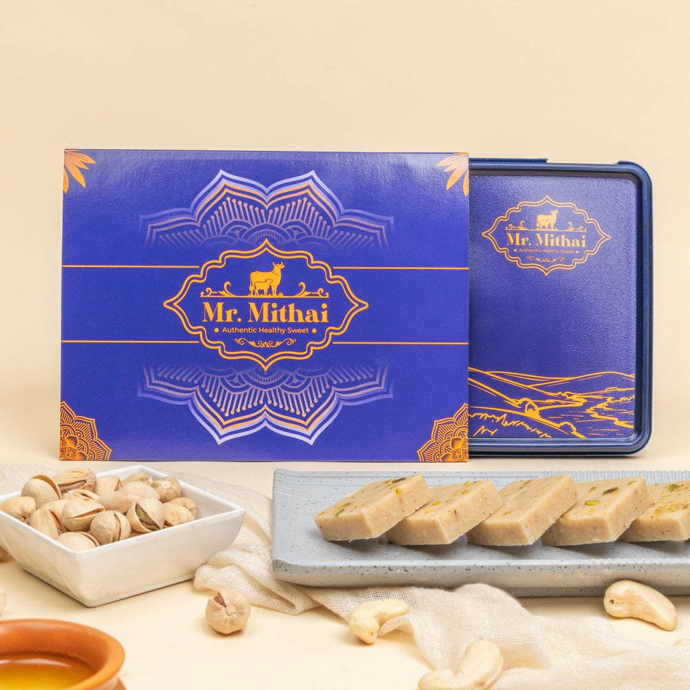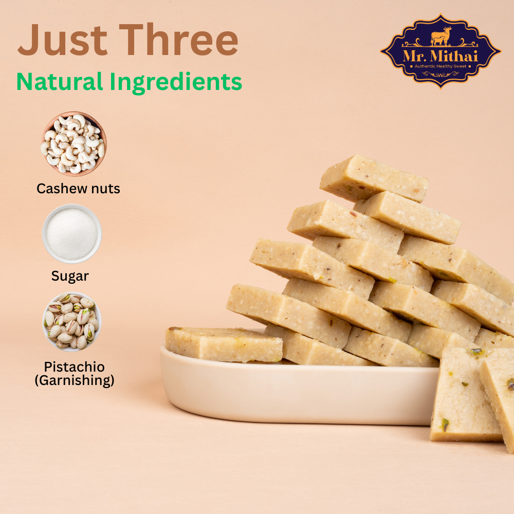 Crafted with premium Cashew nuts, sugar, and garnished with Pistachio, this classic sweet is made fresh for every order, using 100% natural ingredients to ensure the finest quality and rich taste in every bite.